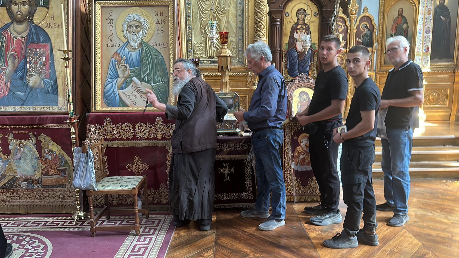 Ne odihnim puţin, iar la ora 18 mergem la slujbă. Ca să ajungem la Biserică, trecem printr-o anexă, aflată în plină constucţie. Lăsăm şi aici pomelnice. Apropo de pomelnice, am văzut că, în timpul slujbei, un părinte le-a dat celor trei părinţi (preoţi) din grupul nostru câte un teanc de pomelnice, pe care aceştia au început să le citească în minte. Eu credeam că numele de pe pomelnice vor fi citite cu glas tare, în biserici, dar mi s-a spus că ele vor fi citite „în taină”. Ar fi fost şi imposibil să fie citite toate cu glas tare, unele de zece, de douăzeci sau de treieci de ori, în funcţie de câţi euro au donat posesorii pomelnicelor.