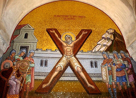 Sfântul Andrei crucificat, pe o cruce din lemn de măslin, sub forma de X. Sursa foto: https://www.crestinortodox.ro/sarbatori/sfantul-apostol-andrei/crucea-sfantului-andrei-141310.html