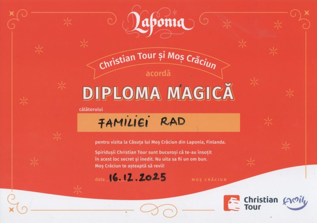 „Christian Tour şi Moş Crăciun acordă DIPLOMA MAGICÃ Familiei Rad, pentru vizita la Căsuţa lui Moş Crăciun din Laponia, Finlanda.