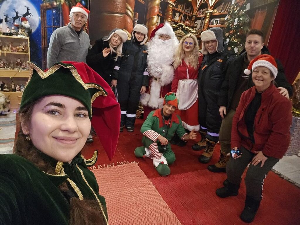 După acest ritual, ni se deschide uşa şi suntem poftiţi înăuntru. Moş Crăciun se ridică dintr-un jilţ imens, sculptat, aşezat în faţa unui brad împodobit, ne îmbrăţişează pe fiecare, ni-i prezintă pe ceilalţi membri ai „familiei” sale (Doamna Crăciun, Spiriduşul Clopoţica şi Spiriduşul fotograf) şi ne întreabă de unde suntem. Spunându-i că unii venim din Cluj, ne întreabă cum stăm cu Festivalulul Untold şi cu metroul lu’ Boc, ceea ce arată că Moşul este foarte conectat la realităţile româneşti. Pe jos, de-a lungul pereţilor, sunt pungi pline de cadori, pentru copiii care îl vizitează, iar pereţii sunt pavoazaţi cu fotografii şi tablouri având elemente de sezon (păduri pline de promoracă, reni etc.). Ni se spune că Moș Crăciun are 2315 ani, iar Doamna Crăciun are 2210 ani! În urmă cu 2025 de ani, în ograda lui Crăciun, se năștea Pruncul Iisus.