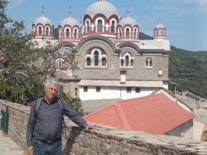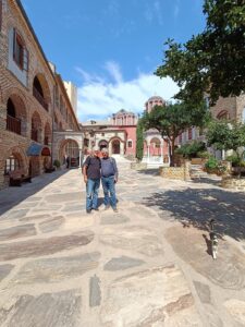 După vizitarea Mănăstirii Pantocrator, ne-am urcat în microbus, pentru a vizita un alt obiectiv. La un moment dat, în faţă ne apare un ansamblu de clădiri, iar Părintele Florin Moldovan ne spune că e vorba de Schitul Proorocului Ilie. Îl întreb pe Părintele Florin Constantin, care era în faţă, lângă şofer, dacă îl putem vizita, fiindcă pe mine m-ar interesa foarte mult, fiind vorba de un schit cu numele pe care îl port şi eu. Mi-a spus ca nu îl putem vizita, din lipsă de timp. N-am comentat nimic, mai ales că am văzut că, în Sfântul Munte Athos, prima regulă a convieţuirii este ascultarea („făgăduinţă de deplină supunere faţă de biserică, făcută de monahi” – DEX). Dar nu trec zece minute şi văd că ne apropiem tot mai mult de schit. M-am bucurat şi am înţeles că Părintele Florin a vrut să îmi facă o surpriză. Dar ce surpriză!