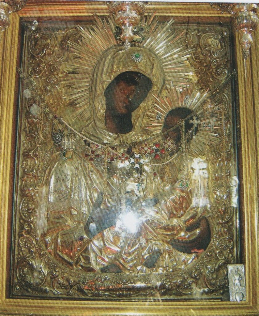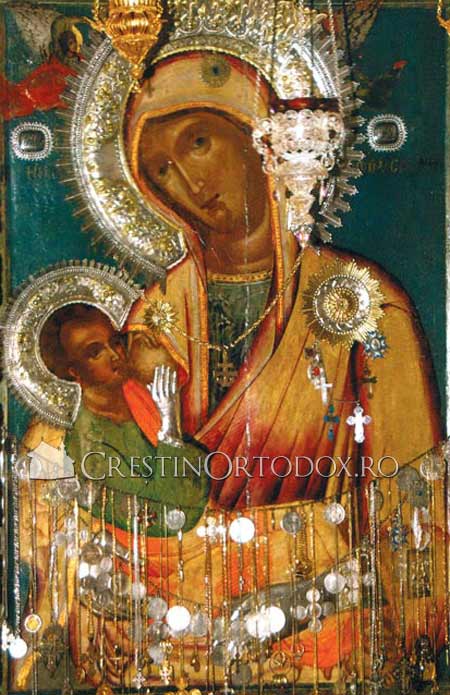 În ce priveşte prima icoană, se spune că, la 17 februarie 1876, un călugăr a observat că din ochii Maicii Domnului curgeau lacrimi. Vestea s-a răspândit în Rusia, iar ţarul Alexandru al II-lea (cel care a fost asasinat de către anarhiştii ruşi, în 1881) 1917) a cerut ca icoana să fie adusă în Rusia. Apoi Ţarul a dus-o în prima linie a frontului, în războiul cu Turcia, din 1877-1878, la care au participat şi românii, care şi-au cucerit astfel independenţa statală. De pe front a fost adusă înapoi, cu unele urme de gloanţe.