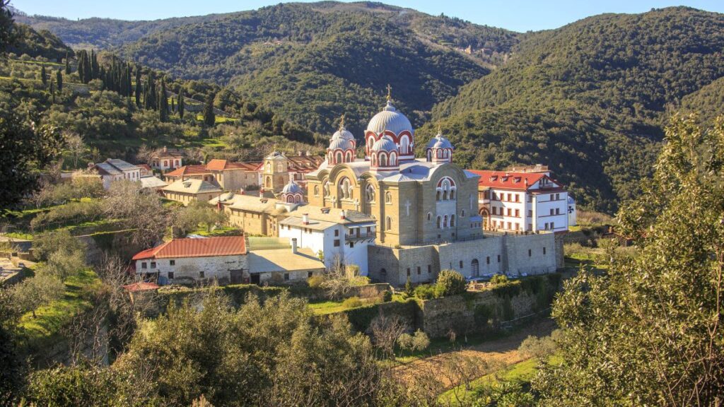 Intrăm în kyriakon şi observăm un iconostas imens, făcut din lemn aurit, tot după model rusesc. Suntem uimiţi că pereţii nu sunt pictaţi şi aflăm şi de ce: izbucnirea Primului Război Mondial şi a revoluţiei bolşevice, cu toate consecinţele acesteia, i-au împiedicat pe ctitori să finalizeze lucrarea. În schimb, acustica este una deosebită (am constatat acest lucru când am intonat cele trei melodii închinate Maicii Domnului). Kyriakonul are trei altare, închinate Sfântului Prooroc Ilie, Sfintei Alexandra şi Sfântului Apostol Andrei. Ni s-a spus că este un lucru rar la Athos, dacă nu unic, şi anume ca un altar să fie închinat unei femei, alta decât Maica Domnului.