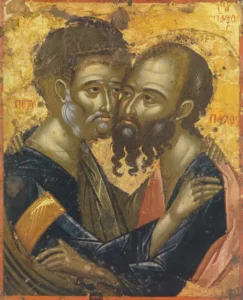 În pridvorul Bisericii, vedem portretele domnitorului Patru Rareş şi al spătarului Petru, amândoi în haine călugăreşti. Intrând în Biserică, ne impresionează un policandru uriaş, despre care ni se spune că, iniţial, acesta a fost agăţat de gâtul Pantocratorului, ulterior fiind atârnat de baza turlei, cum este normal.