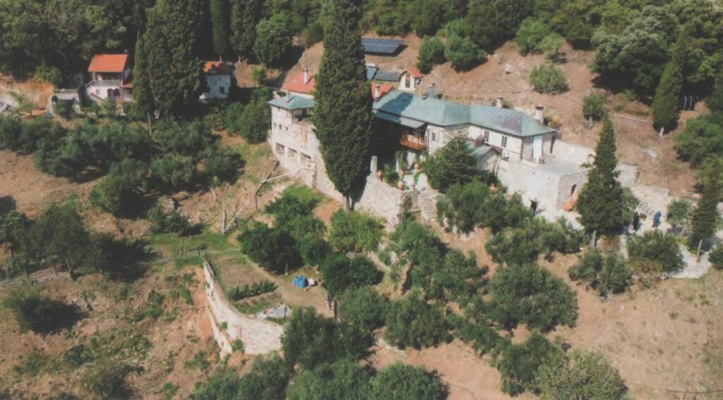 După vizitarea Mănăstirii Vatoped, am coborât pe o cărare destul de neumblată, spre chilia românească a Sfântului Marelui Mucenic Gheorghe, pe care am găsit-o aproape ascunsă sub bogata vegetaţie din jur.