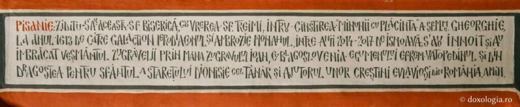 La intrare este şi o Pisanie[1], cu următorul text: „Ziditu-s-au această Sf. Biserică, cu vrerea Sf. Treimi, întru cinstirea «Minunii cu plăcinta» a Sf. M.M. Gheorghie, la anul 1613, de către Galaction, Irodiaconul[2], şi Ambrozie, Monahul. Între anii 2014-2017 de isnoavă[3] s-au înnoit şi au îmbrăcat veşmântul zugrăvelii prin mâna zugravului Ioan, cu blagoslovenia Egumenului Efrem Vatopedinul şi din dragostea pentru Sfântul a stareţului Dionisie cel tânăr[4] şi ajutorul unor creştini enoriaşi din România. Amin.”